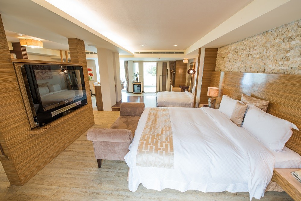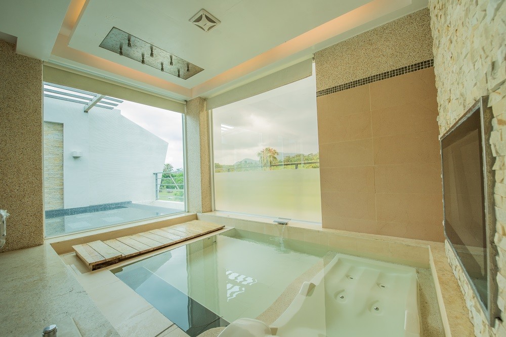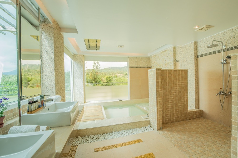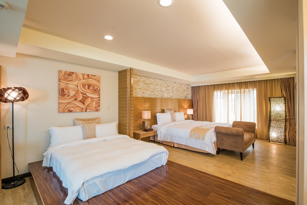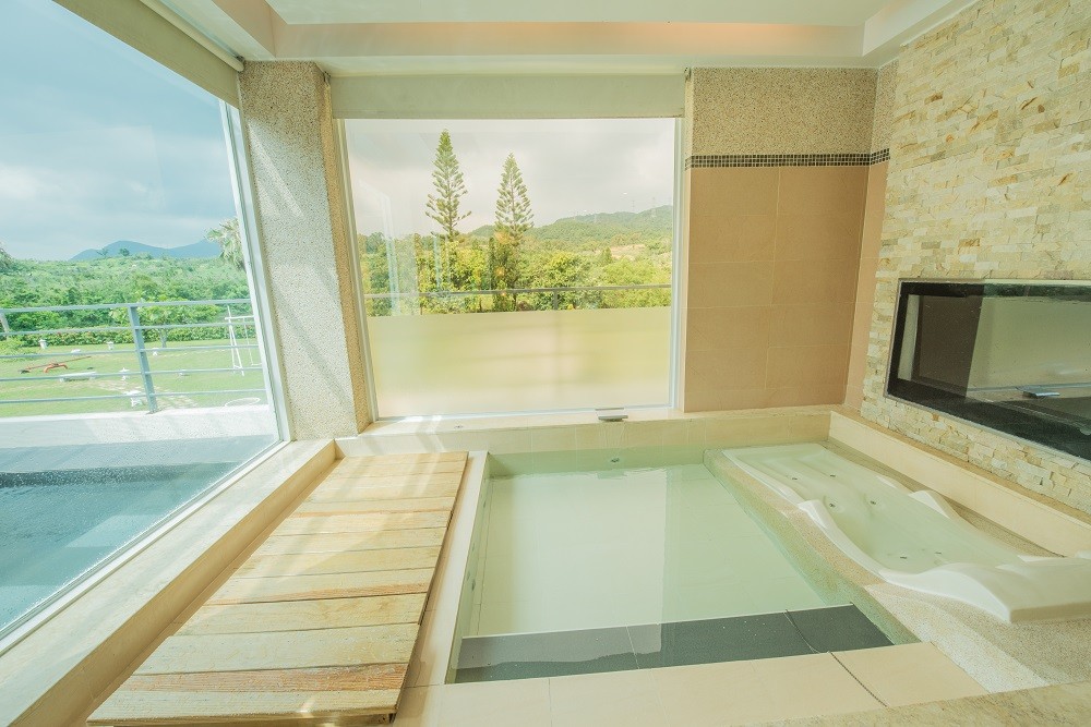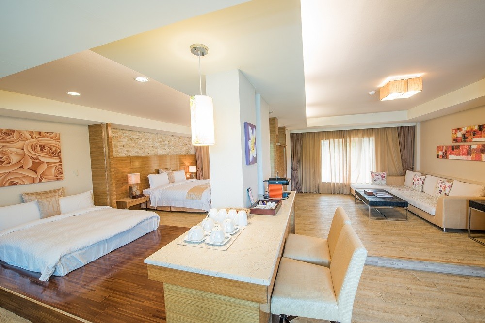 總統觀景套房,一樓設有私人獨立車庫,房間約40坪,房內有兩大床,吧檯有提供咖啡機、免費小餅乾以及冰涼飲品可享用,SPA 按摩浴缸大玻璃可享受邊泡澡邊賞面山景,戶外陽台不僅有好的風景,白天有綠意山景,晚上有寧靜夜空,還有戲水池適合小朋友戲水,樓下後方有藍天白雲,綠色山景與綠地還有盪鞦韆、蹺蹺板可供遊玩,也是適合拍照的好地方。